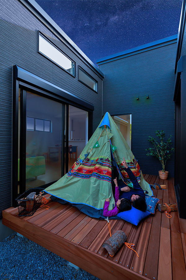 中庭ウッドデッキでは、星空を眺められるのかなとか、テント張れるねとか夢が広がっちゃいます。